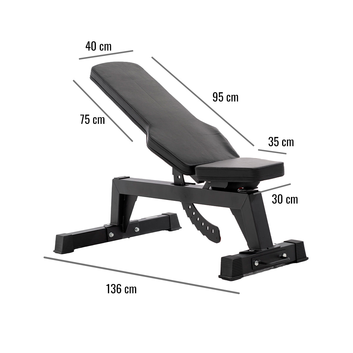 Cuenta con 12 posiciones de respaldo y 4 posiciones de asiento, permitiendo usarlo como banca plana, inclinada o declinada.