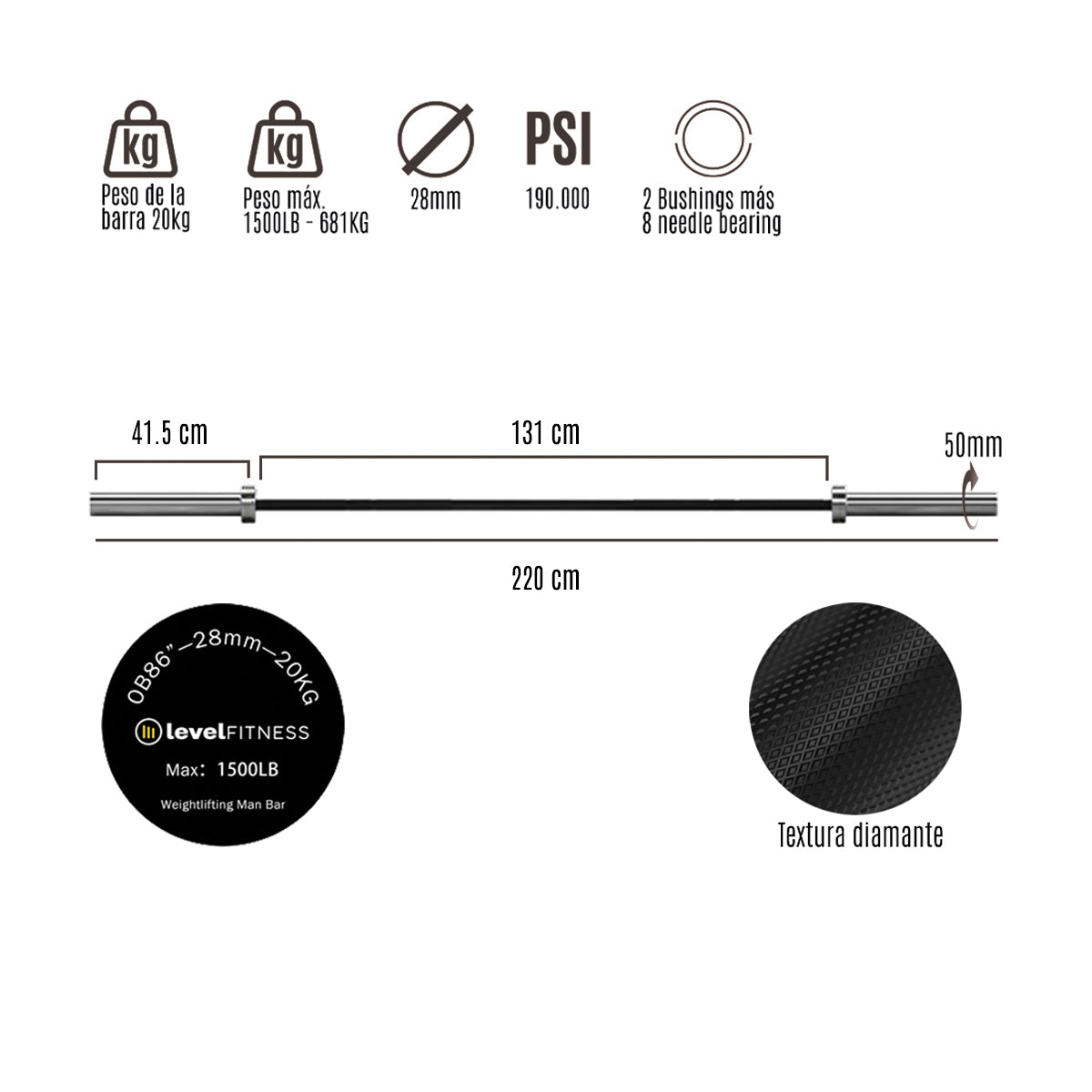 Diámetro estándar: 28 mm, ideal para barras olímpicas masculinas.