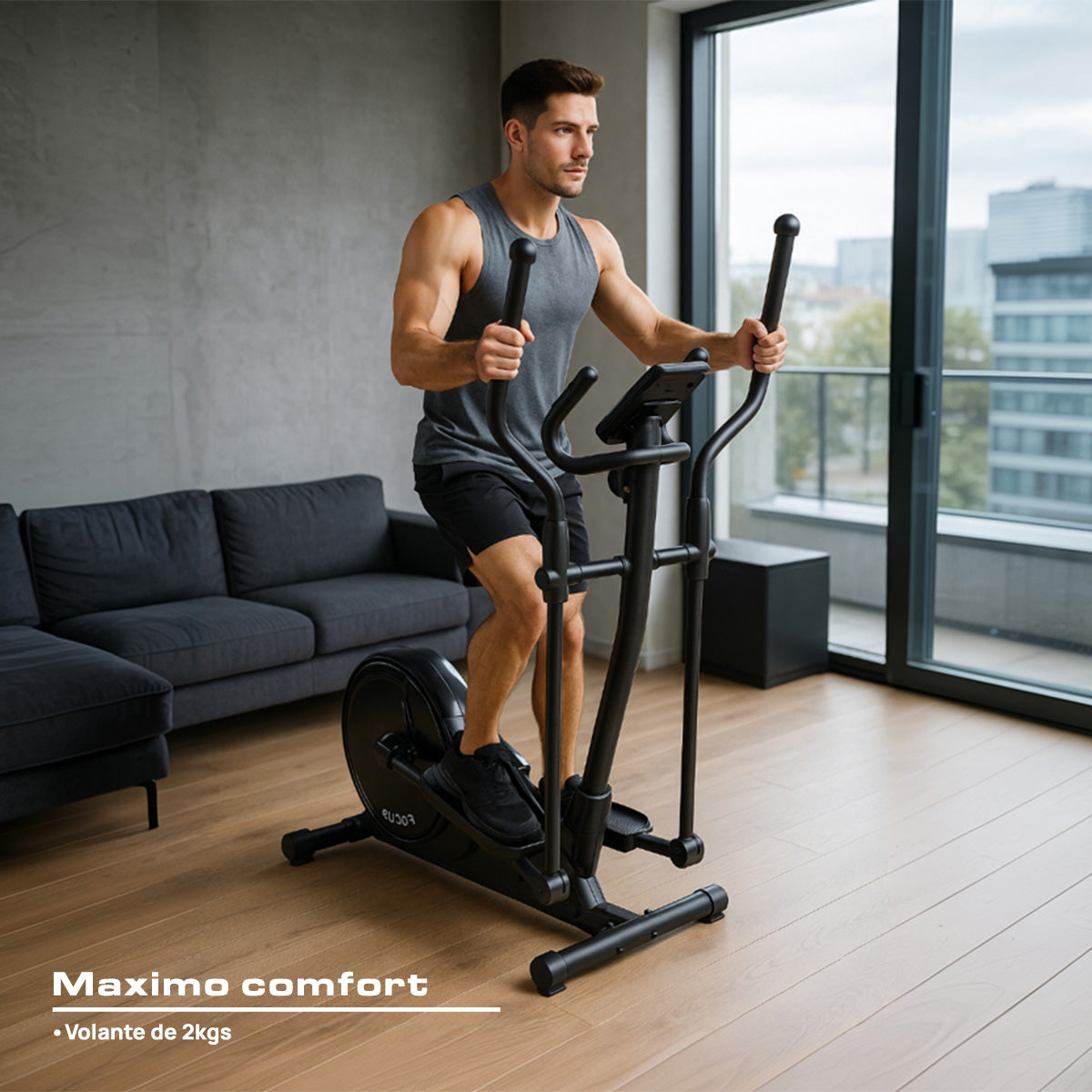La Elíptica CROSS 2.0 Negra es un entrenador elíptico de alto rendimiento que combina tecnología, comodidad y funcionalidad para entrenamientos completos en casa. Equipada con un volante de inercia de 2 kg y resistencia magnética ajustable en 8 o 16 niveles, permite personalizar la intensidad del ejercicio según el nivel del usuario. Cuenta con un display LED con control tipo “Flying Shuttle” que muestra funciones como tiempo, distancia, odómetro, calorías, pulso, velocidad y nivel de resistencia, además de conectividad Bluetooth. El monitoreo de ritmo cardíaco se realiza mediante sensores de mano, y soporta un peso máximo de usuario de 120 kg. Su estructura robusta viene empacada con protección de espuma y caja reforzada, con dimensiones de 103.5 x 44.5 x 61 cm y peso neto/bruto de 32/37 kg. Ideal para quienes buscan una elíptica moderna, compacta y eficiente para entrenar todo el cuerpo sin salir de casa.