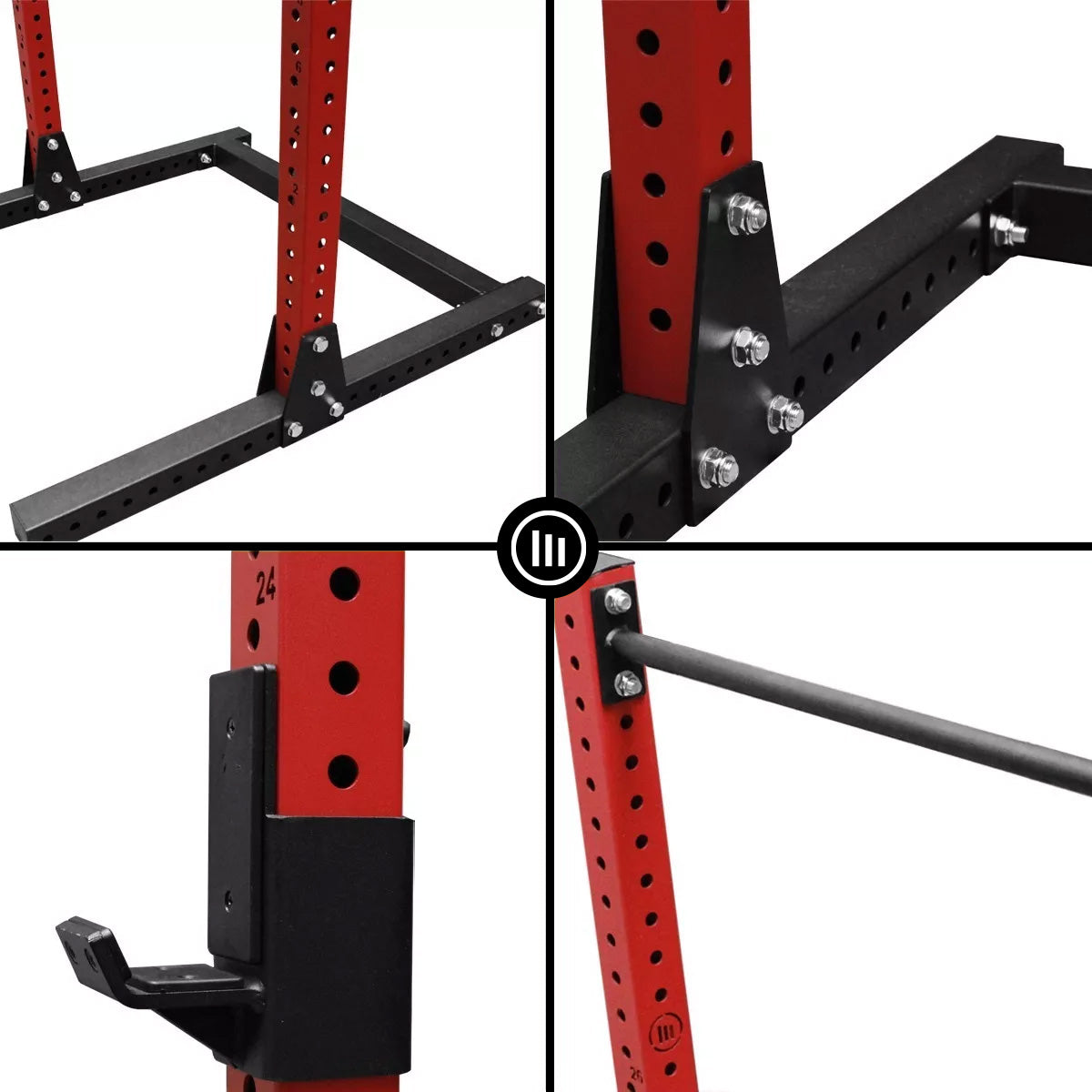 Accesorios completos: Incluye J-Cups (soportes para barra olímpica) y toda la tornillería necesaria para su instalación.